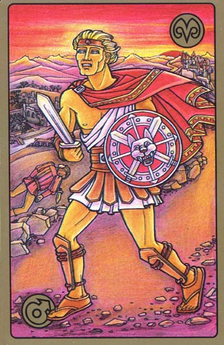 Карта описывает состояния, характерные для Овнов на разных уровнях проявления. Во-первых, это состояние агрессии, постоянная готовность к бою, способность идти на конфликт, на ссору, изо всех сил отстаивая собственные интересы или стремясь захватить новые территории. Во-вторых, Овнам свойственно ощущать себя энергичными, способными на многое, испытывать безграничную уверенность в собственных силах, желание что-то делать, постоянно двигаться. Такое состояние более миролюбиво, нежели предыдущее: напор и энергия могут быть направлены на быстрое, хотя и непродуманное выполнение дел. В-третьих, одно из состояний Овнов — неизбывная жажда приключений, спортивный азарт, оптимизм. Я все знаю, я самостоятелен, — в полный голос заявляет нам воин, изображенный на карте Овна. — Не учите меня жить, лучше уйдите с дороги, я сам со всем справлюсь!